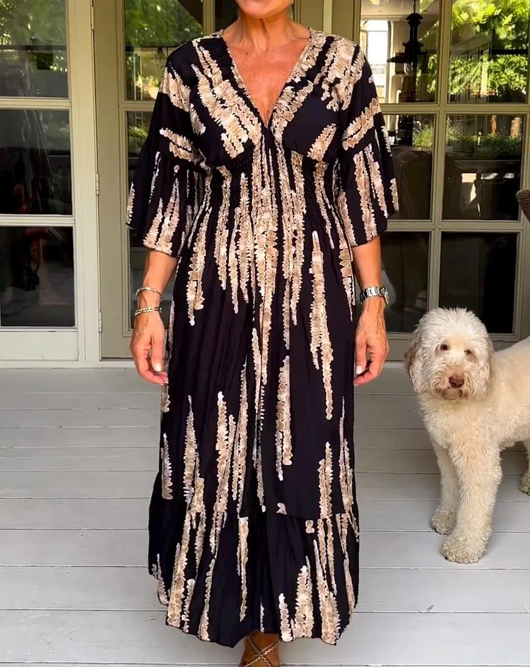 [Design Highlights]: The dress boasts an eye-catching tie-dye print with stylish vertical abstract patterns. It is detailed with three-quarter bell sleeves adding a touch of sophistication, and a tiered skirt for added volume and dynamic movement.